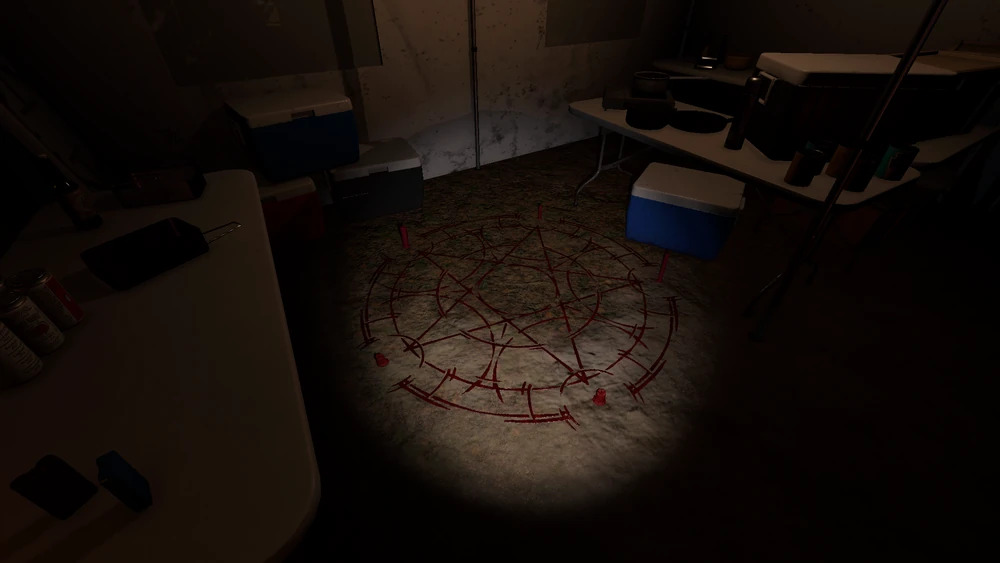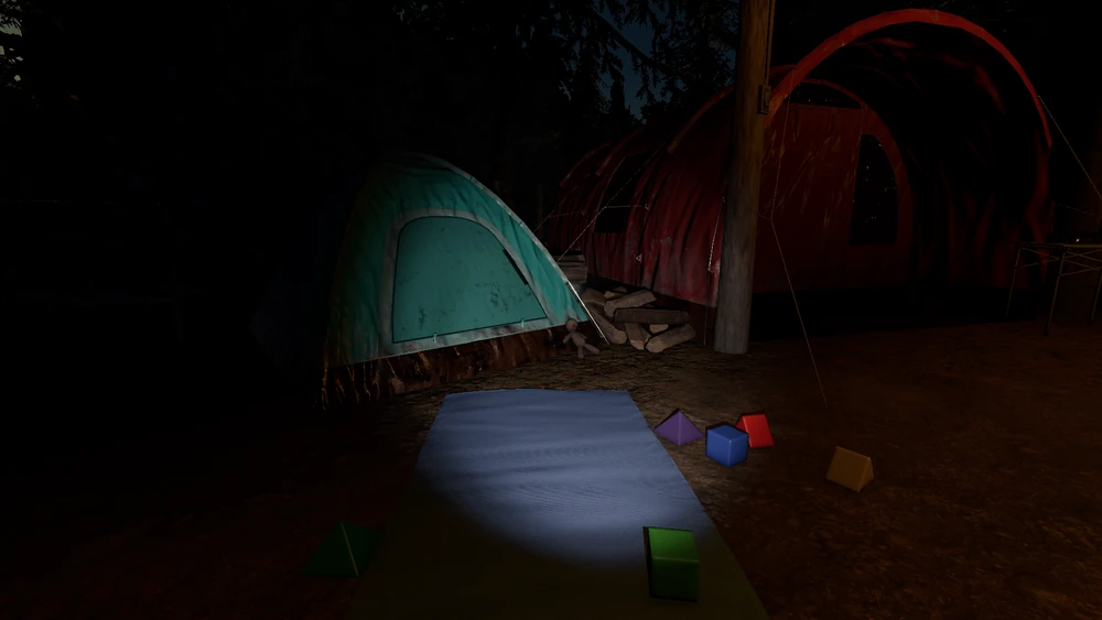 Die Voodoo-Puppe erscheint vor dem kleinen türkisfarbenen Zelt neben dem roten Zelt