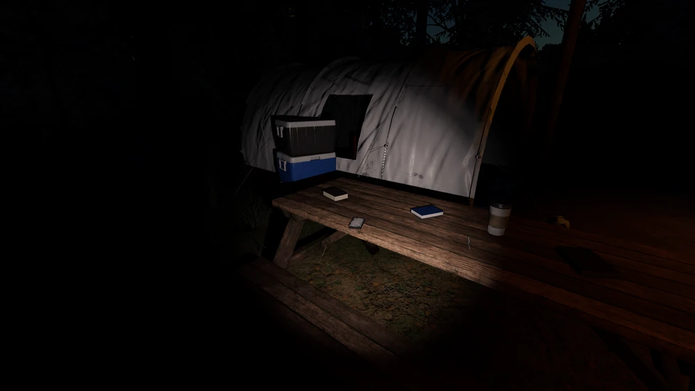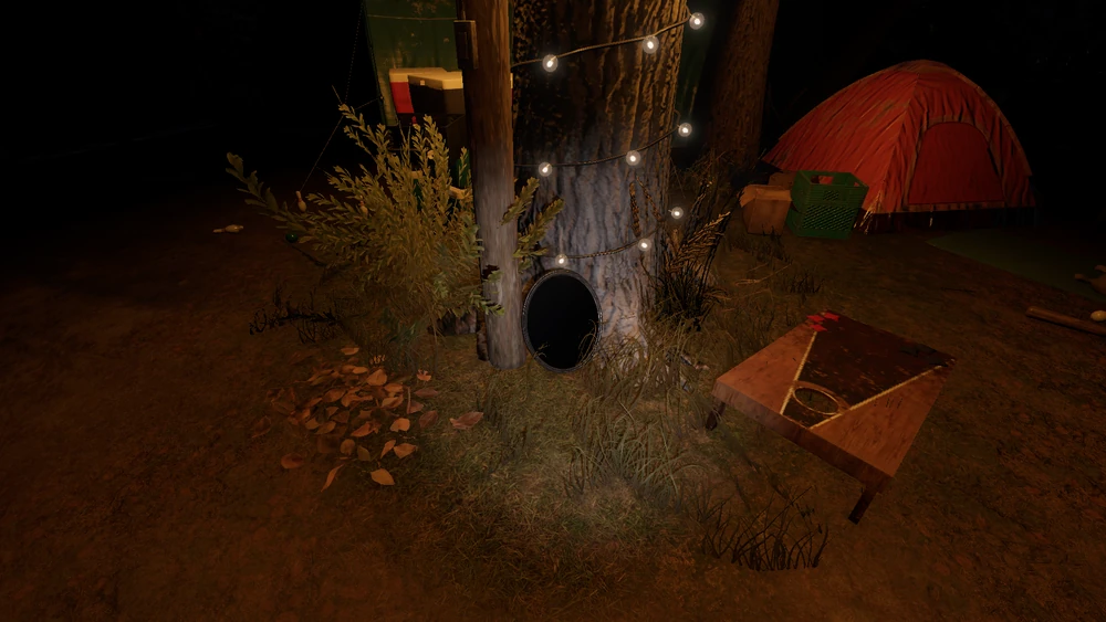 Der Spiegel erscheint an einem Baum mit Lichterketten in der Nähe des Lagerfeuers